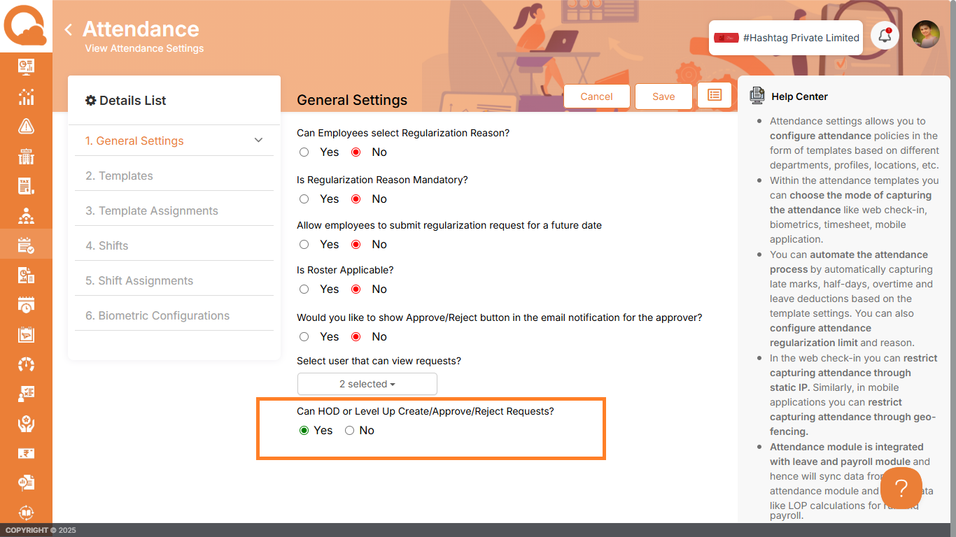 We’ve added a setting in Attendance, Leave and Expense General Settings to define if HOD (Head of Department) and Level Up Supervisors can create, approve or reject requests. If enabled, both roles can take full action including request creation, approval and rejection, mapped to the employee’s reporting hierarchy. When disabled, they receive view-only access without workflow control, ensuring governance while maintaining transparency and reducing operational bottlenecks.