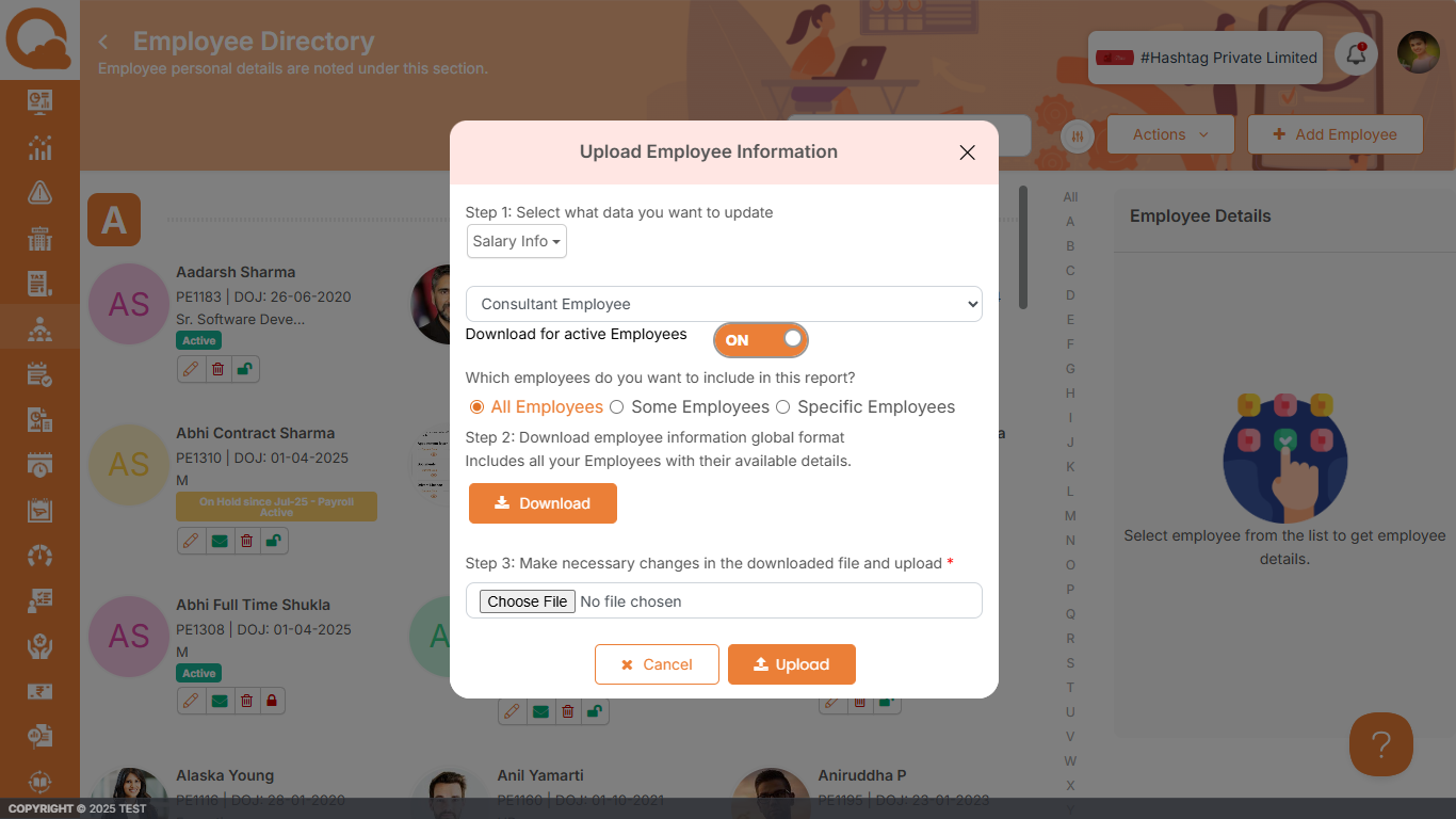 Admins can now update consultant salary details in bulk via Employee Directory → Actions → Bulk Update Employee Data → Salary Information. The module supports template download, filled data upload and a specific selection for consultant employees. This eliminates repetitive manual entry, accelerates payroll input preparation and improves accuracy when managing large consultant workforces.