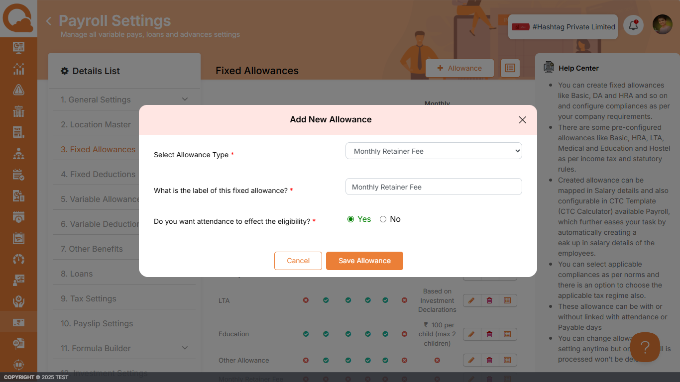We enhanced Fixed Allowance settings to support multiple Monthly Retainer Fee entries. Admins can configure them under Payroll Settings → Fixed Allowance → Add Fixed Allowance → Allowance Type: Monthly Retainer Fee. This is useful for organizations managing retainers with varied fee structures. It ensures cleaner breakup of payroll components. The update reduces workaround dependency and improves payout accuracy.